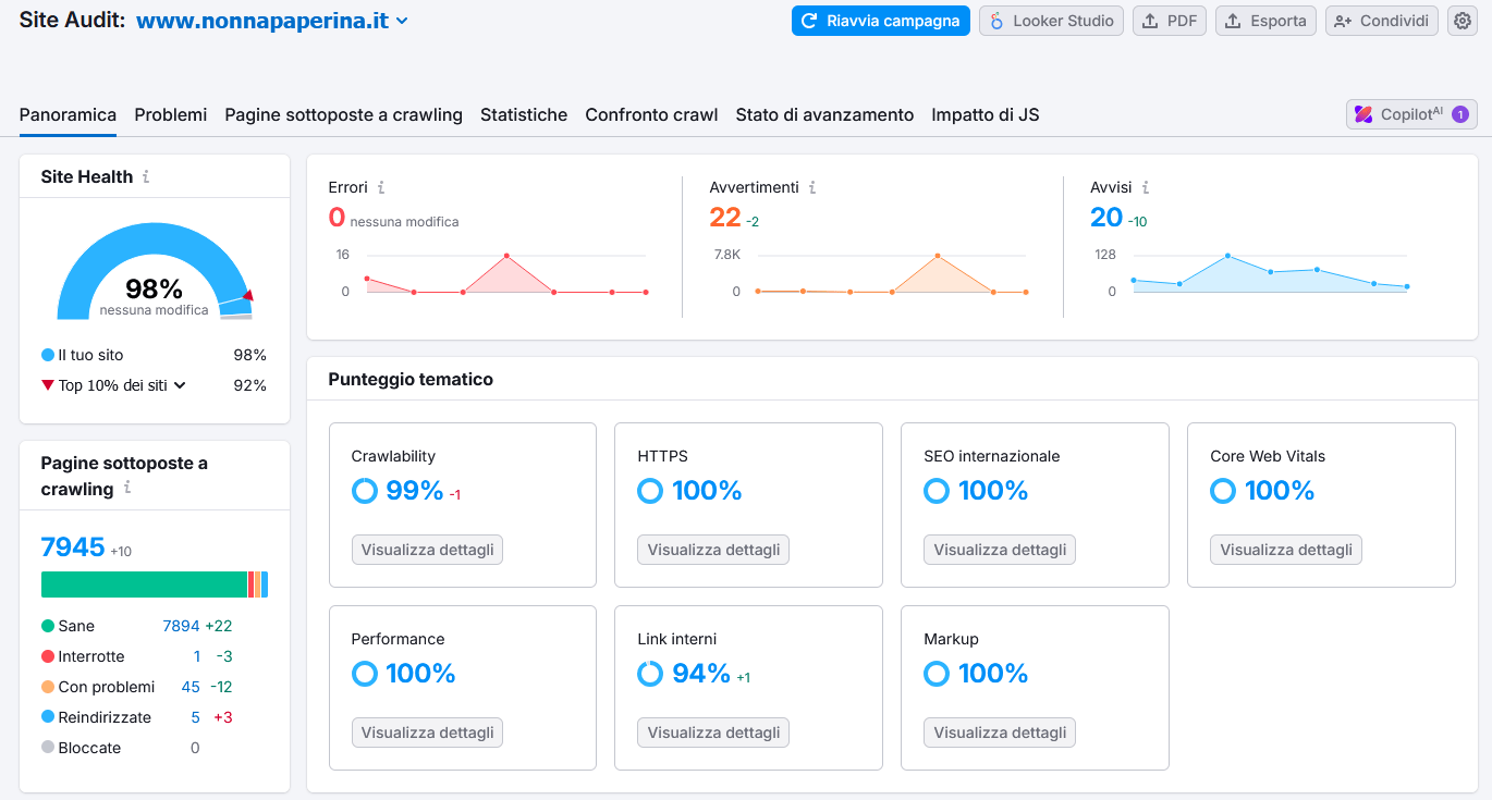 La Site Audit nella dashboard di Semrush: l’indice di salute del sito (Site Health) sfiora il 100%.