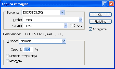 Duplichiamo l’immagine, dopodichè andiamo sul menu image — > apply image (immagine — > applica immagine)