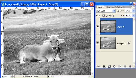 Per finire, duplichiamo il livello di sfondo e vi applichiamo un effetto di soft light tramite il menu di fusione (blending mode)