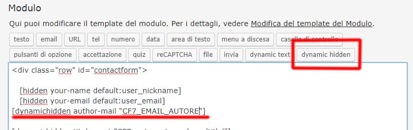 All’interno della nostra form aggiungiamo il campo dynamic hidden e assegnamogli come valore il nome del nostro shortocode: CF7_EMAIL_AUTORE (vedremo più avanti come crearlo).